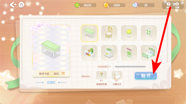 3、接著可制作家具,選擇想要制作的家具,準(zhǔn)備好所需材料后點(diǎn)擊制作,制作完成的家具可用于裝飾家園。