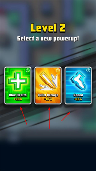 4、當(dāng)關(guān)卡推進(jìn)到新的等級(jí)時(shí),可選擇新的能力強(qiáng)化,提升角色的生命值、子彈傷害或移動(dòng)速度等屬性。