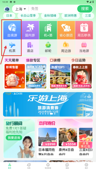 1、打開旅游類應(yīng)用,點擊出境游功能入口,進(jìn)入出境游頁面。
