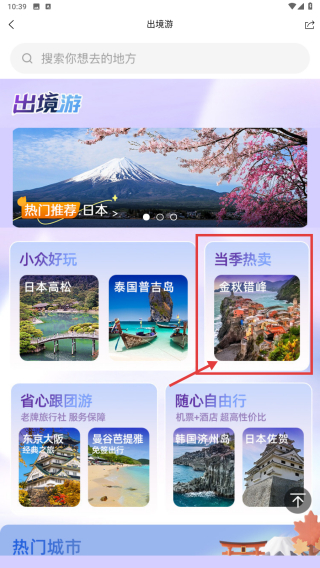 2、在出境游頁面,選擇金秋錯峰主題,進(jìn)入對應(yīng)產(chǎn)品列表。