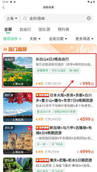 3、在產(chǎn)品列表中,找到長白山4日3晚自由行條目¥999起/人,宿萬達(dá)智選假日酒店,點擊進(jìn)入產(chǎn)品詳情頁。