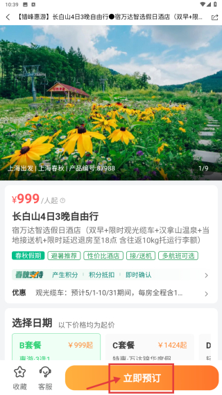 4、在產(chǎn)品詳情頁,點擊立即預(yù)訂按鈕,發(fā)起旅游產(chǎn)品預(yù)訂操作。