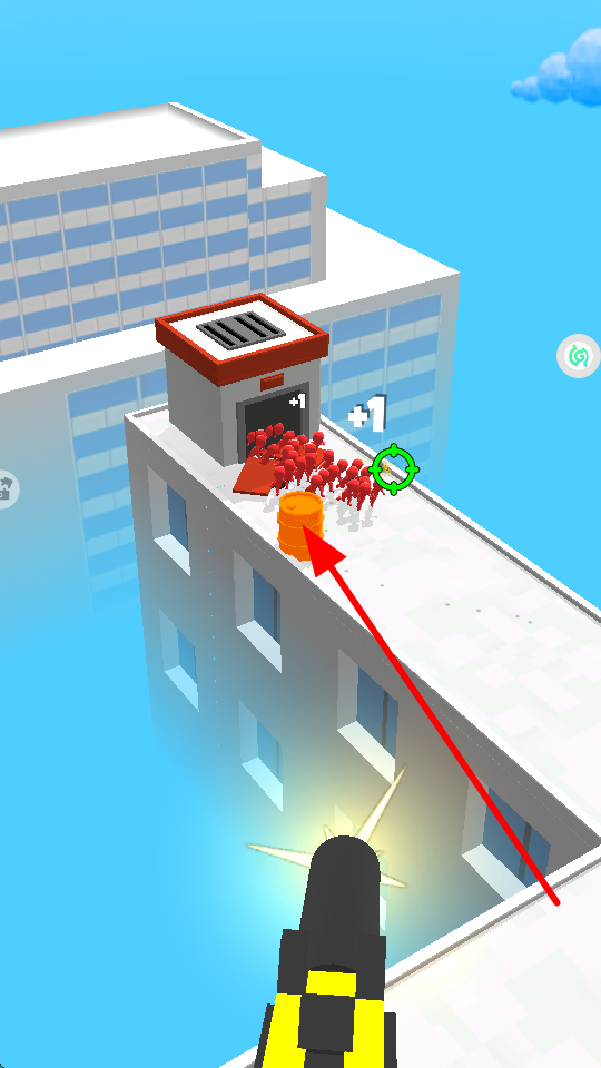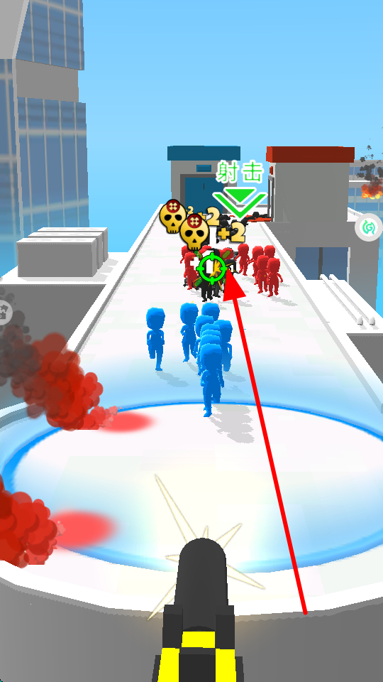 1、滑動屏幕精準瞄準敵人,接著果斷射擊,消滅紅色敵人,保護藍色小人順利前進。