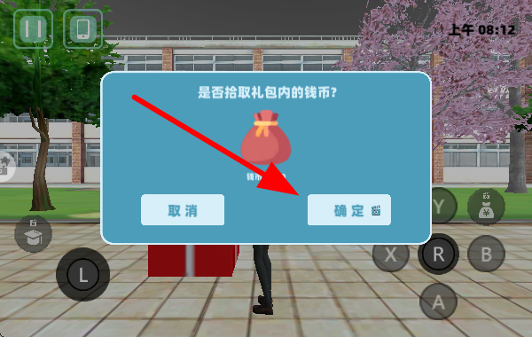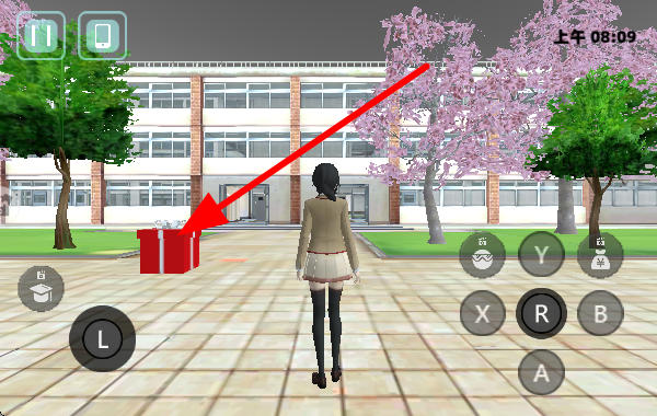 3、玩家在校園里尋找紅色禮包盒子,找到后靠近它,準(zhǔn)備開啟禮包獲取里面的物品。