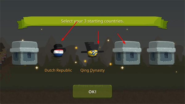 1、選擇3個(gè)起始國(guó)家,比如可選擇Dutch Republic、Qing Dynasty等,選好后點(diǎn)擊OK!進(jìn)入游戲。