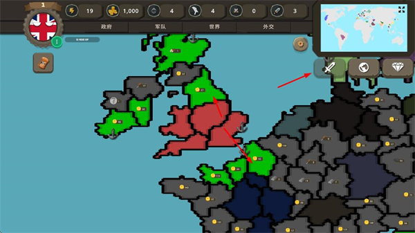 2、在世界地圖界面,可查看不同國(guó)家的區(qū)域分布,利用相關(guān)功能按鈕,進(jìn)行領(lǐng)土等方面的操作與規(guī)劃。