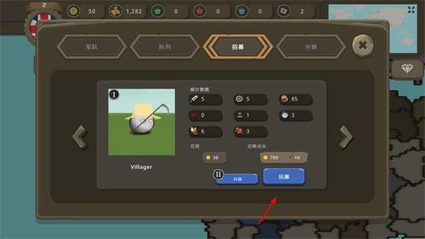 3、進(jìn)入招募界面,可查看Villager等單位的屬性,消耗資源點(diǎn)擊招募按鈕,獲取對(duì)應(yīng)單位,壯大力量。
