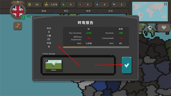 4、會(huì)出現(xiàn)轉(zhuǎn)彎報(bào)告,顯示稅收收入、軍事支出等財(cái)務(wù)及單位準(zhǔn)備情況,查看后點(diǎn)擊確認(rèn)按鈕,繼續(xù)游戲進(jìn)程。