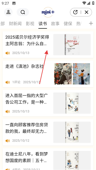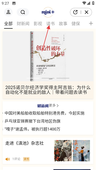 2、在mini+頁面,選擇想閱讀的內(nèi)容,如讀書,點擊進入讀書板塊。