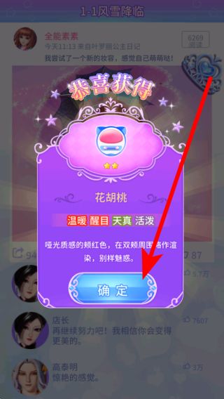 3、完成妝容后,會(huì)獲得相應(yīng)獎(jiǎng)勵(lì),像花胡桃這類(lèi)美妝道具,點(diǎn)擊確定領(lǐng)取,這些獎(jiǎng)勵(lì)可用于后續(xù)更多妝容的打造與游戲內(nèi)容的解鎖。