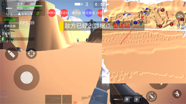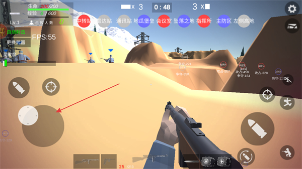 2、點擊左下方移動按鈕操控角色,在沙漠場景中移動尋找敵人。