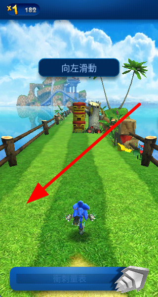 1、遇到岔路或障礙,向左滑動(dòng)屏幕,讓索尼克向左移動(dòng),避開(kāi)阻礙,繼續(xù)在跑道上奔跑,收集沿途道具。