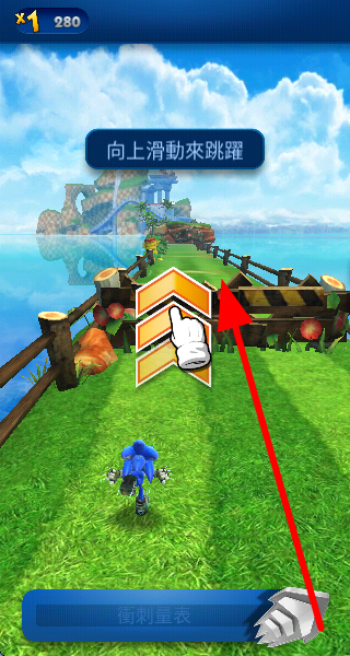 2、碰到需要跨越的障礙時(shí),向上滑動(dòng)屏幕,索尼克會(huì)跳起,越過(guò)障礙,保持前進(jìn),爭(zhēng)取跑得更遠(yuǎn)。