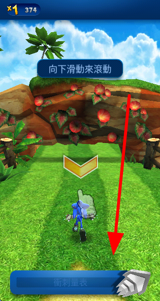 3、前方有低矮通道時(shí),向下滑動(dòng)屏幕,索尼克會(huì)滾動(dòng)起來(lái),穿過(guò)通道,避免碰撞,持續(xù)向目標(biāo)前進(jìn)。