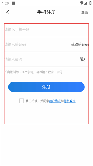 4、在手機注冊頁面,輸入信息,勾選協(xié)議后,點擊注冊,完成注冊流程。