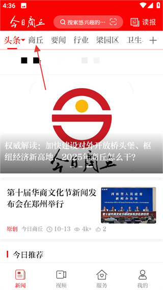 1、進入軟件新聞頁面,點擊商丘標簽,切換到商丘相關(guān)新聞頁面。