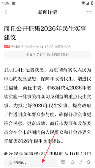 3、在新聞詳情頁,點擊寫評論,進入評論輸入頁面。