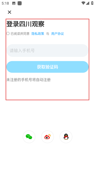 3、在登錄四川觀察頁面,勾選協(xié)議,輸入信息,完成登錄流程。