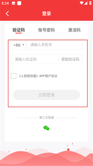 3、在登錄頁面選擇驗證碼登錄,輸入信息,并點擊立即登錄即可完成操作。