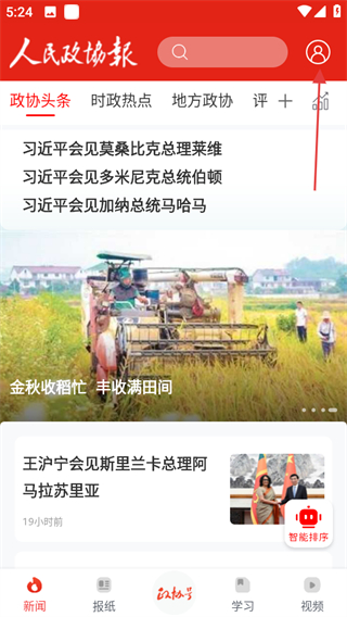 1、進(jìn)入人民政協(xié)報APP首頁,點擊右上角個人圖標(biāo),進(jìn)入個人頁面。
