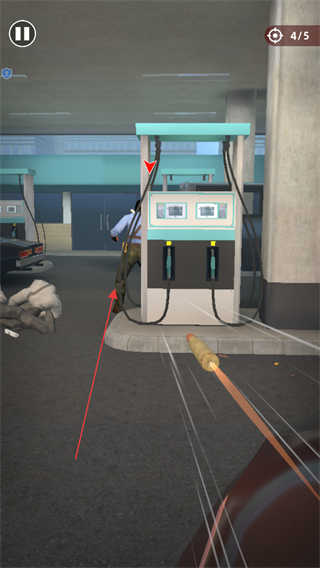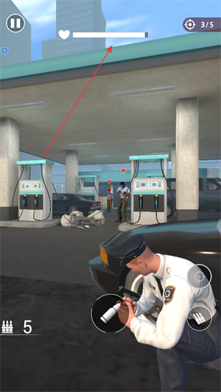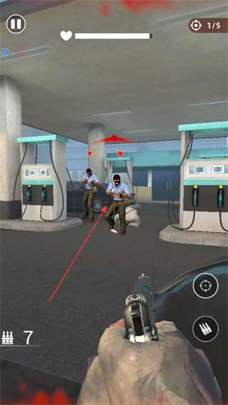 1、進(jìn)入游戲,留意屏幕上方顯示的剩余敵人數(shù)量如1/5,使用屏幕操作按鈕控制視角和射擊,對準(zhǔn)敵人開槍射擊。
