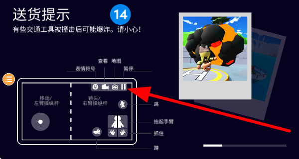 1、進入會有送貨提示,告知交通工具被撞擊可能爆炸等注意事項,同時展示操作按鍵,方便了解操作。