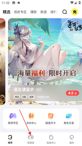 1、進(jìn)入游戲fan手游折扣平臺(tái),在首頁(yè)點(diǎn)擊底部找游戲,進(jìn)入游戲查找頁(yè)面。