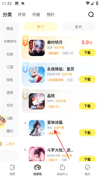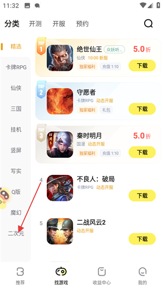 2、在游戲查找頁(yè)面,點(diǎn)擊左側(cè)二次元分類,進(jìn)入二次元游戲列表頁(yè)面。