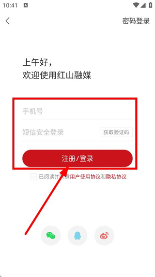 4、輸入手機(jī)號(hào)、獲取并輸入驗(yàn)證碼,點(diǎn)擊注冊(cè)/登錄,完成登錄操作。
