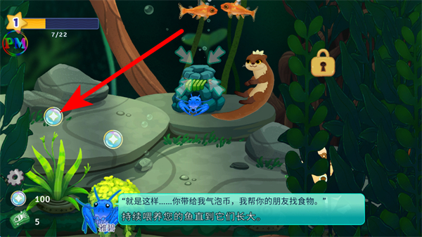 2、進入游戲后,游戲里有像氣泡幣這樣的資源,可用于和其他角色交互,比如用氣泡幣讓角色幫忙找食物,同時也要持續(xù)喂養(yǎng)魚類,助力它們成長。
