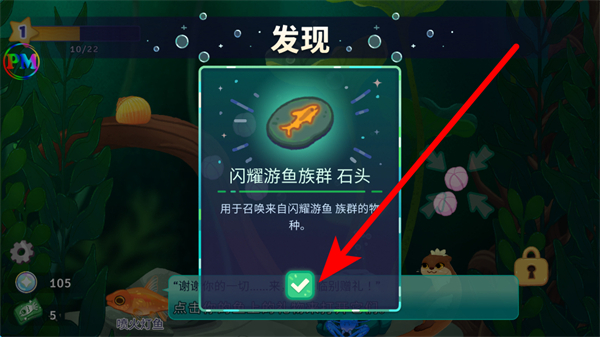 1、進入游戲,會有諸如閃耀游魚族群石頭這類道具,它可用于召喚特定族群的物種,獲取后點擊相關(guān)按鈕即可打開并使用。