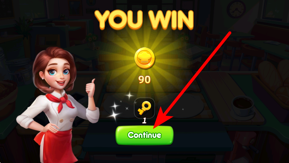 4、成功完成烹飪挑戰(zhàn)后,會(huì)獲得金幣、鑰匙等獎(jiǎng)勵(lì),點(diǎn)擊繼續(xù)按鈕可開(kāi)啟新的烹飪?nèi)蝿?wù),不斷挑戰(zhàn)能解鎖更多菜品和場(chǎng)景,推動(dòng)經(jīng)營(yíng)持續(xù)發(fā)展。