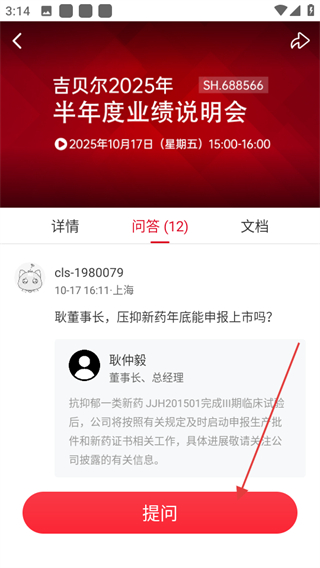 3、在業(yè)績(jī)說(shuō)明會(huì)詳情頁(yè)面,點(diǎn)擊提問(wèn),若未登錄會(huì)進(jìn)入登錄頁(yè)面。