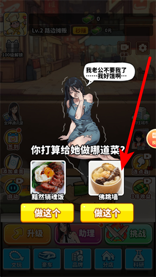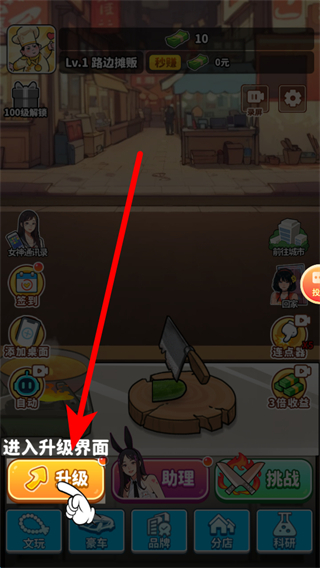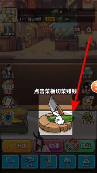 1、初始操作,進(jìn)入游戲后,玩家從路邊攤販開始,按照提示點(diǎn)擊菜板切菜,切菜動(dòng)作能為玩家賺取初始資金,這是積累啟動(dòng)財(cái)富的關(guān)鍵步驟,需反復(fù)操作來(lái)獲取金錢。