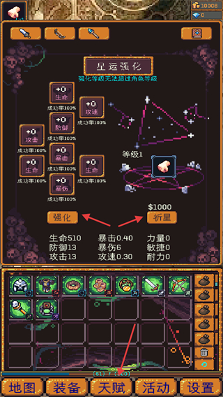 2、進(jìn)入天賦界面用星運(yùn)強(qiáng)化消耗資源強(qiáng)化或祈星來(lái)提高生命攻擊等屬性。