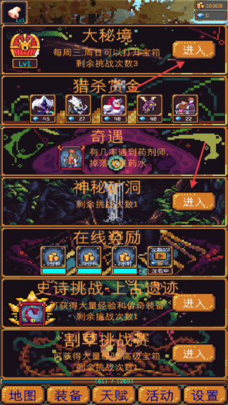 4、點(diǎn)擊活動(dòng)按鈕,查看可以參與的活動(dòng)副本,例如大秘境、獵殺賞金等,點(diǎn)擊進(jìn)入即可進(jìn)行副本挑戰(zhàn)。