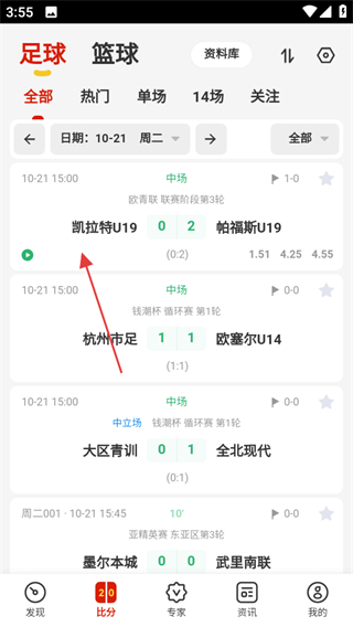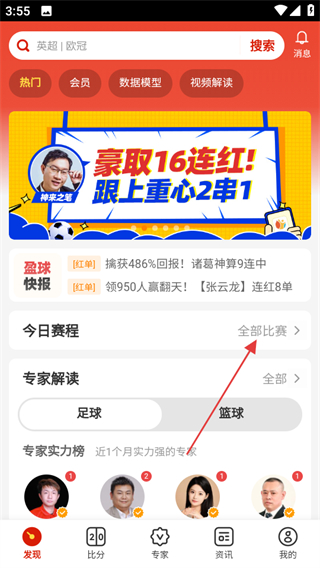 1、進(jìn)入天天盈球發(fā)現(xiàn)頁面,點(diǎn)擊全部比賽,進(jìn)入比賽列表頁面。