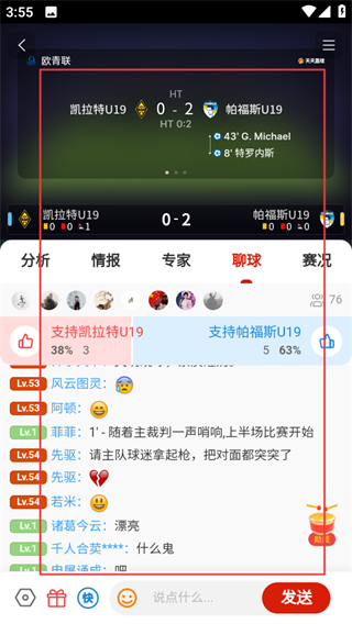 3、在比賽詳情頁面,可查看比賽實(shí)時(shí)比分、賽況,還能參與聊球互動(dòng)。
