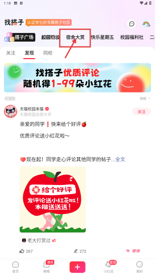 2、在找搭子頁面,點(diǎn)擊宿舍大賞選項(xiàng),進(jìn)入宿舍大賞板塊。
