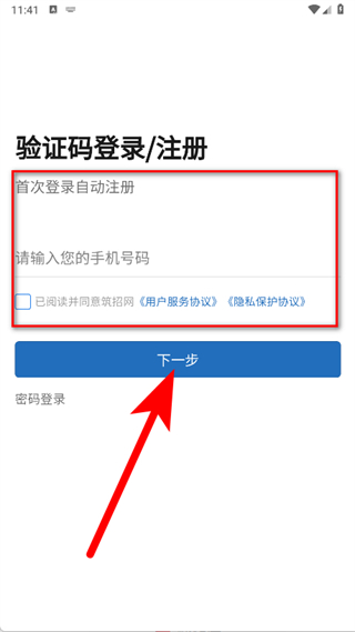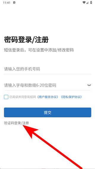 2、進入密碼登錄注冊頁面后,點擊驗證碼登錄注冊選項。