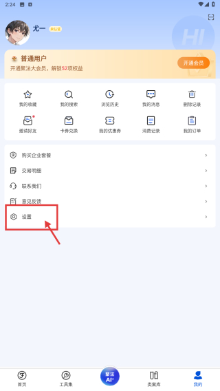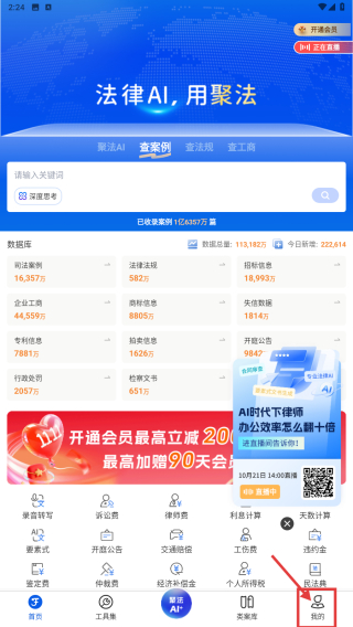 1、打開(kāi)聚法法律AI應(yīng)用,點(diǎn)擊底部我的選項(xiàng),進(jìn)入個(gè)人中心頁(yè)面。