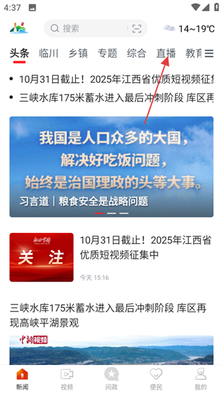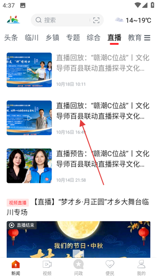 1、進(jìn)入臨川發(fā)布,在首頁點(diǎn)擊直播,進(jìn)入直播板塊頁面。