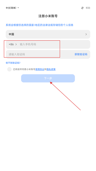 3、輸入手機(jī)號(hào)碼、驗(yàn)證碼,再點(diǎn)擊下一步即可注冊(cè)成功。