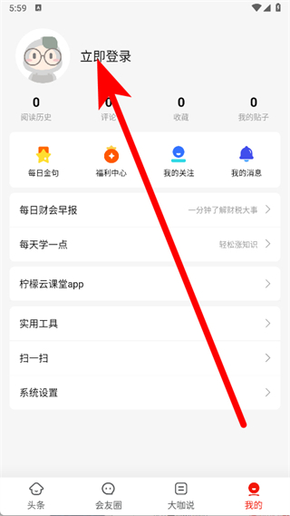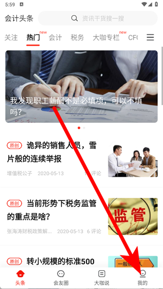 1、打開(kāi)會(huì)計(jì)頭條,點(diǎn)擊底部導(dǎo)航欄最右側(cè)的我的。