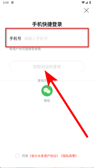 3、在手機(jī)快捷登錄頁(yè)面輸入手機(jī)號(hào),勾選同意后,點(diǎn)擊獲取驗(yàn)證碼登錄。