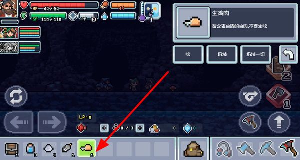 2、在道具欄點(diǎn)擊生雞肉等道具,選擇吃、扔掉或扔掉一切,合理處理道具能維持角色狀態(tài)。