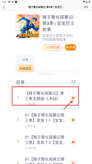 4、在內(nèi)容列表的目錄里,點(diǎn)擊猴子警長(zhǎng)探案記第三季主題曲決戰(zhàn)條目,開(kāi)始播放該音頻。