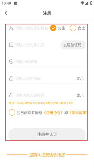 4、在注冊頁面,按要求填寫信息,同意協(xié)議后點擊注冊并認證即可完成注冊。