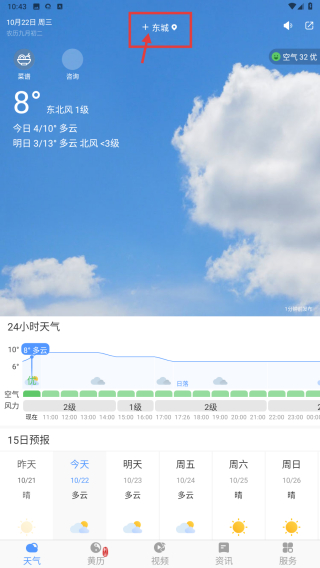 1、打開(kāi)天氣應(yīng)用,點(diǎn)擊頂部+城市選項(xiàng),進(jìn)入城市管理頁(yè)面。