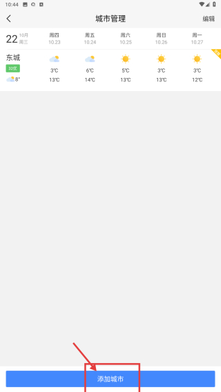 2、在城市管理頁(yè)面,點(diǎn)擊添加城市按鈕,進(jìn)入城市選擇界面。